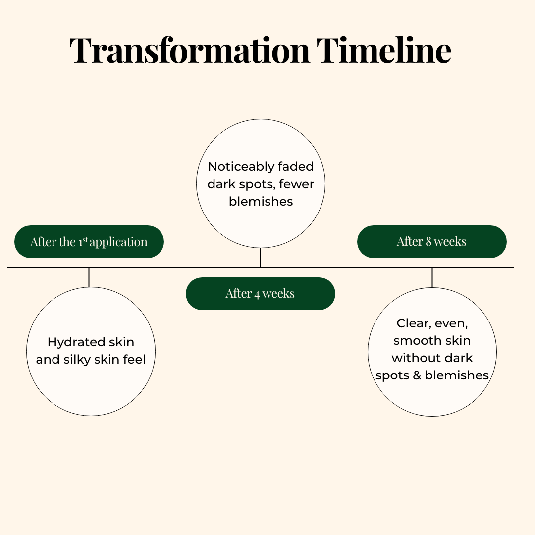 Skin renewal is a process that takes a few weeks. Many users report noticeably softer skin and a more even complexion after about 2–4 weeks. Dark spots and hyperpigmentation usually take at least 6–8 weeks, depending on your skin type and routine. A more realistic timeframe is about 3 months, as also noted in scientific studies. Dark spots are difficult to treat and require a lot of patience and consistency. Stick with it—and don’t forget: sunscreen every day is key, even in winter!